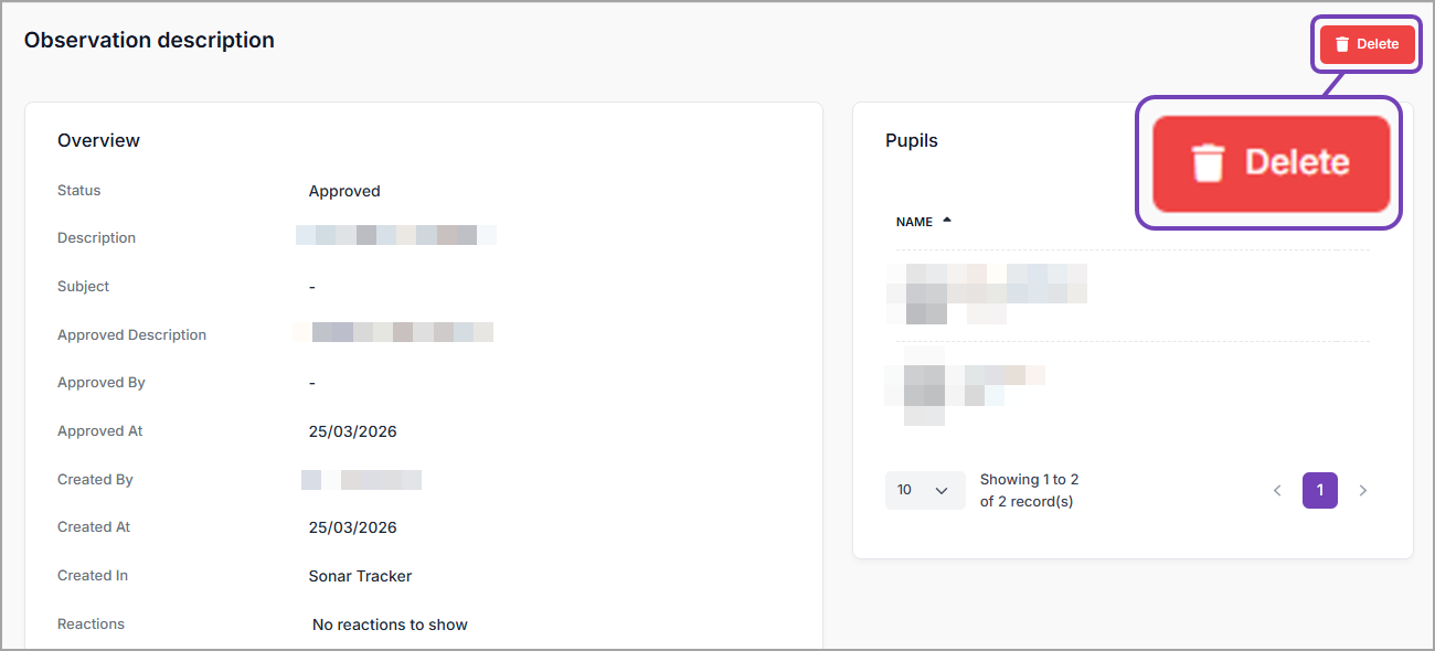 You can only delete approved observations from the current academic year that have been approved. An observation Pending Approval or that has been Declined cannot be deleted. An observation from a previous academic year cannot be approved. If the observation includes multiple pupils, deleting it will remove the observation from all pupils (you cannot delete it for a subset of pupils to whom it was awarded).