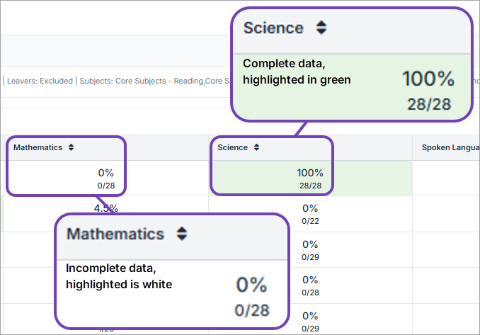 3. Easily see primary summative assessment data entry completion status through colour-coding of cells for each subject: