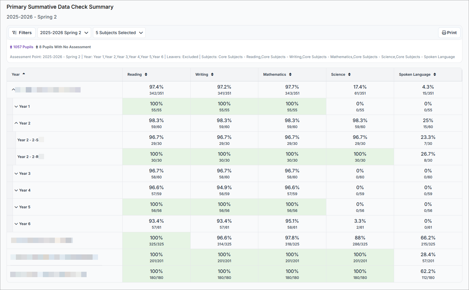 2. Rapidly identify gaps at a school, year group, or class level where primary summative assessments have not been completed, allowing you to follow up with the appropriate staff as needed.