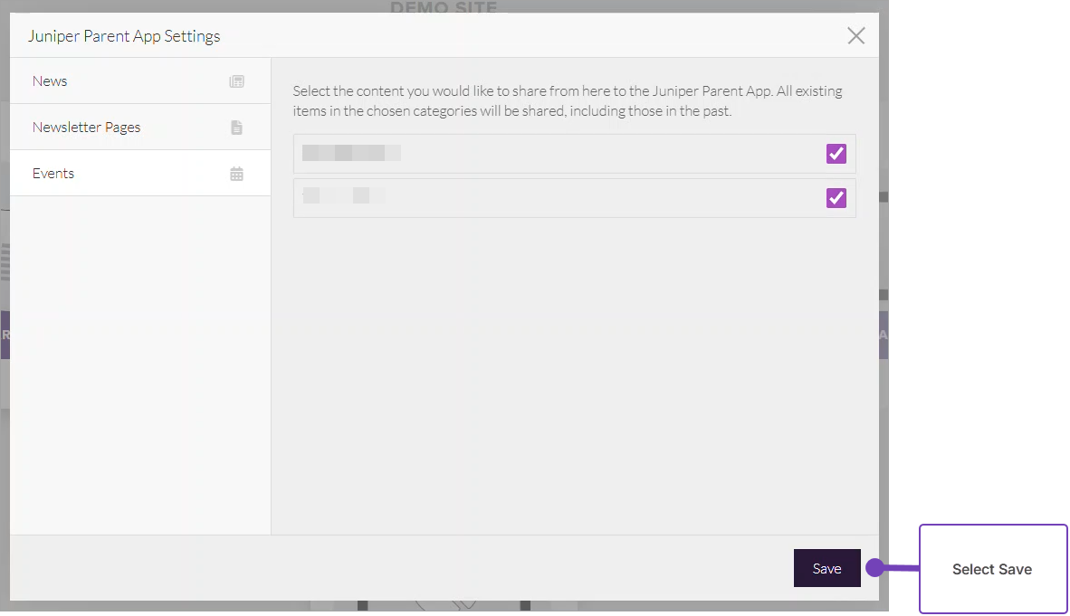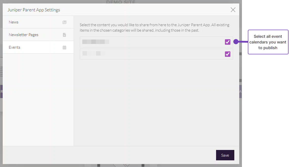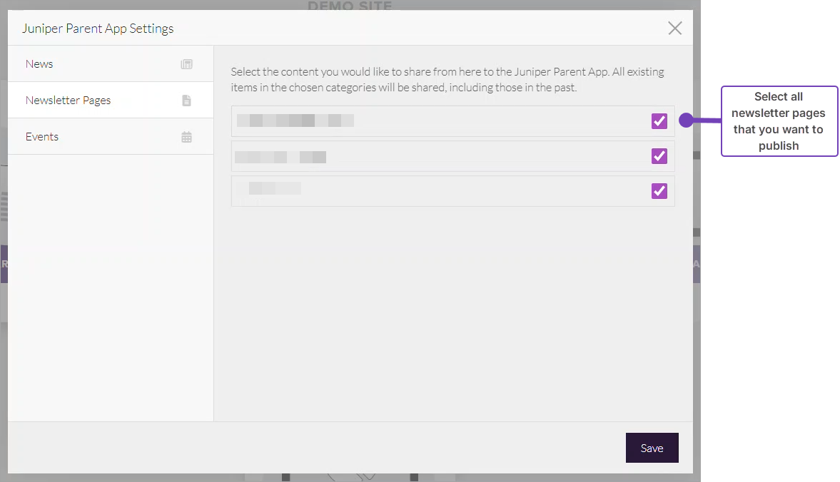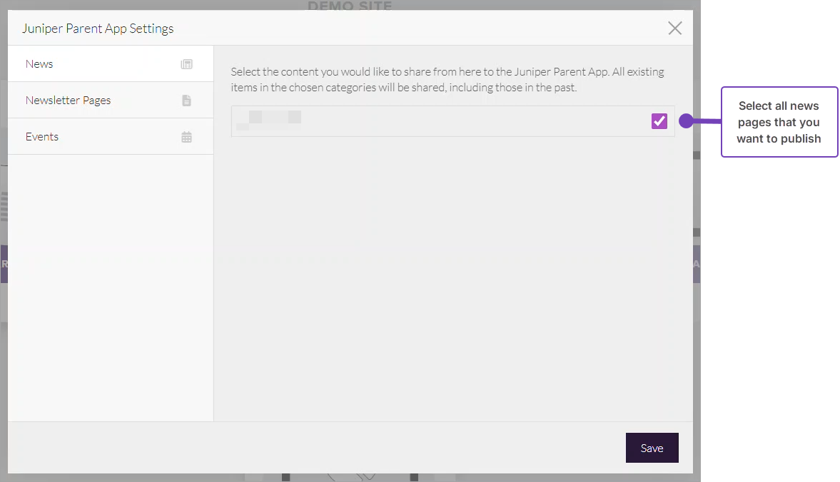 - From Juniper Parent App Settings, work through the three tabs, News, Newsletter Pages and Events in turn: