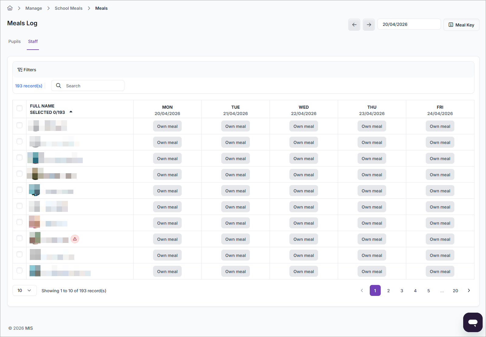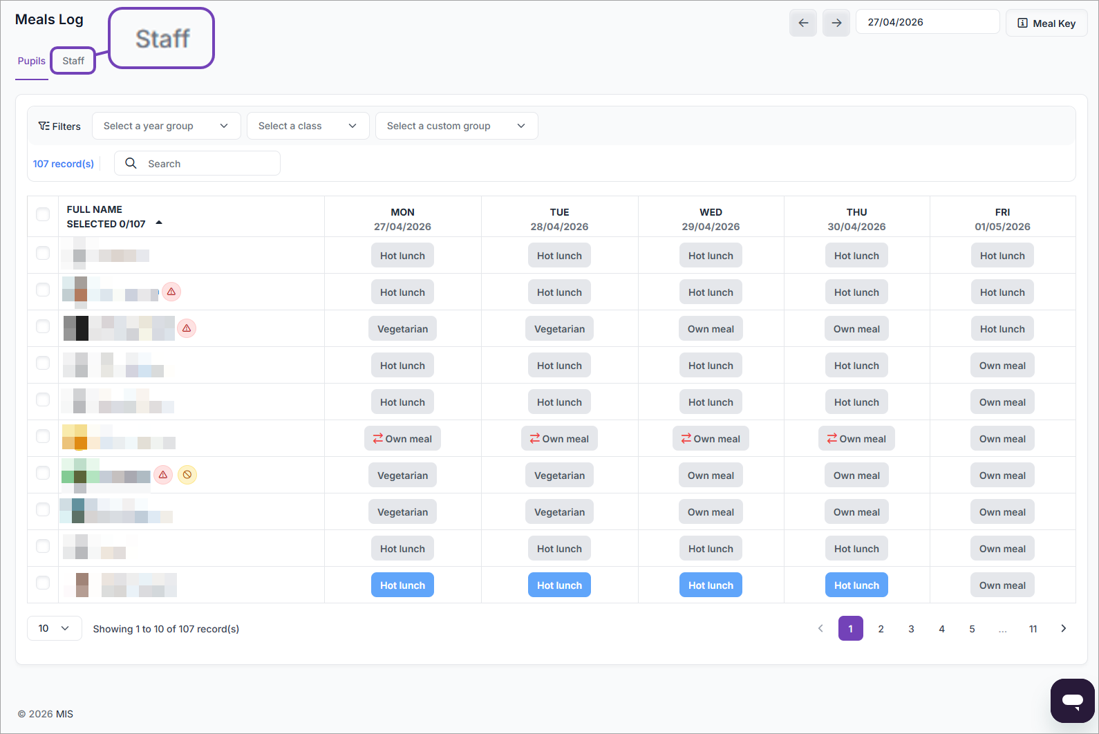 This article explains how to see a list of staff member meals for the current week using the Meals Log.